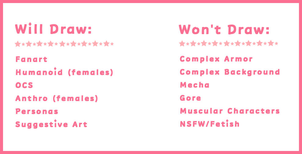 - All commissions will be done through Artistree and I'll be able to communicate with you through the website.- I own the rights to the artwork. This means; I can use the art to promote, post, etc.- If you don't want me to post a commission, please tell me beforehand.- Payment must be 100% upfront after the sketch approval (I accept payment through PayPal (USD).- I have the right to refuse commissions if I'm not comfortable with it.- You can suggest changes when I send the sketch for approval, but multiple changes (3 MAX) will cost extra.- You are not allowed to use my art for AI, NFTS, etc.- Commissions are personal use ONLY.- Prices are subject to change overtime.- You can use the artwork as a icon, header, post on social media, etc, but ONLY with credit.- I don't offer a refund for a finished or almost finished commission (unless I cancel the commission).- When I send the final commission, there'll be two versions, the watermarked version and one without. You can ONLY post the watermarked version online.